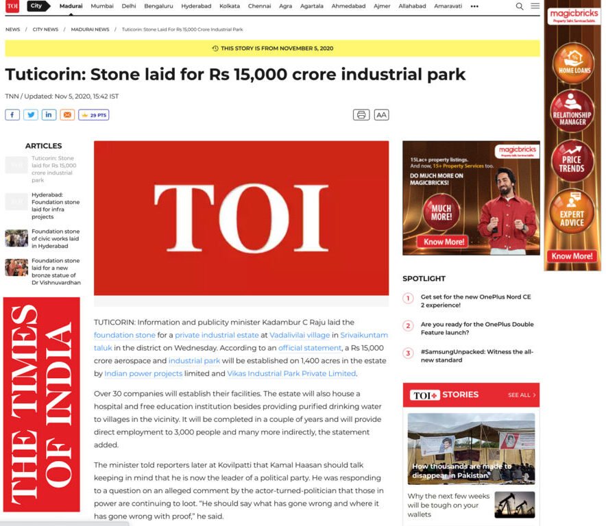 M/s Vikas Industrial Park Pvt. Ltd. (VIPPL), promoted by Challa Group, is developing a project of setting up Aerospace & Industrial Development Park along with a Power Project at Pannamparai Village, Sathankulam Taluq, Thoothukudi District of Tamilnadu State and this project is named as “Mega Integrated Industrial Park”. Tamilnadu state based organizations, Indian Power Projects Limited & Indian Integrated Energy Limited also associated with VIPPL, in developing this mega project.